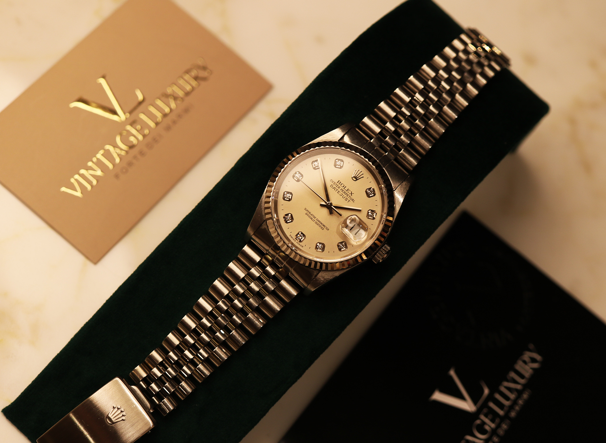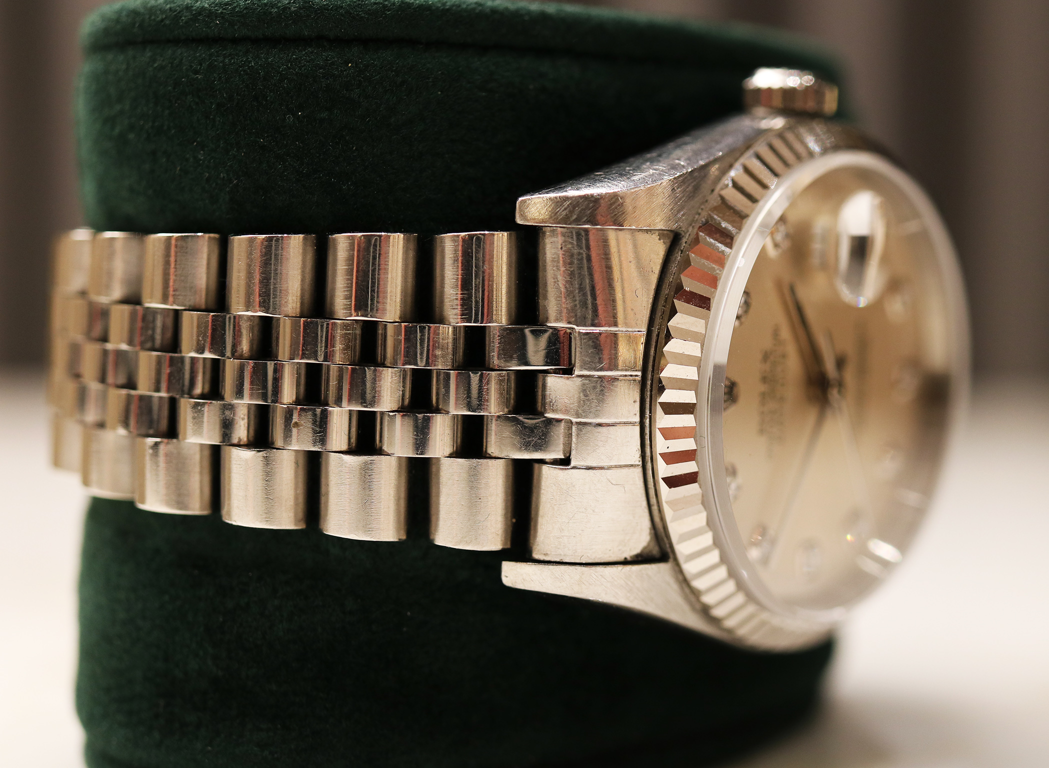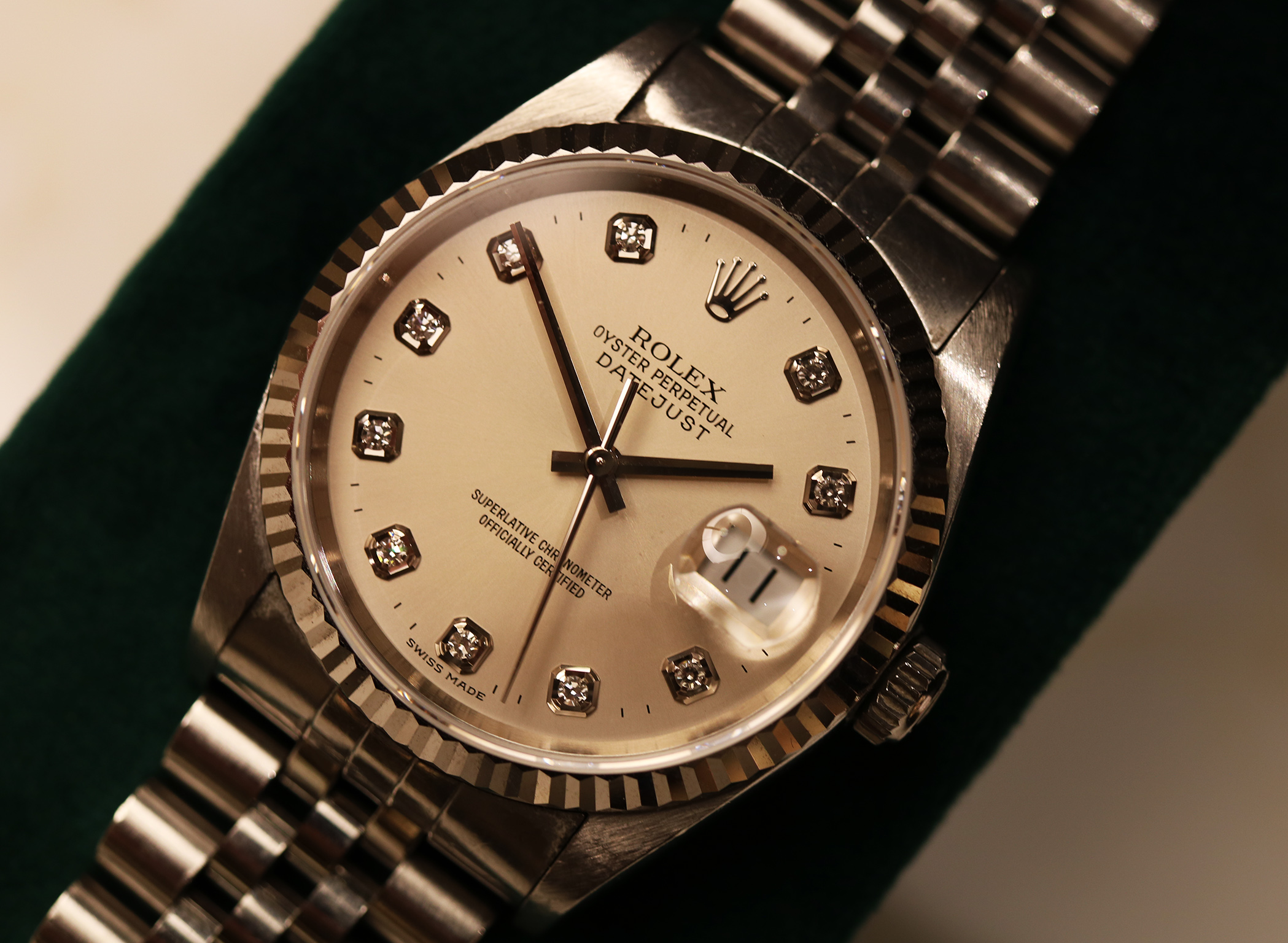 Questo esemplare si distingue per il quadrante argenté con indici in diamanti, una combinazione che conferisce luminosità e prestigio all’orologio mantenendo al tempo stesso un’estetica estremamente equilibrata. Gli indici in diamanti applicati catturano la luce con eleganza, impreziosendo il quadrante senza rinunciare alla tipica sobrietà Rolex.