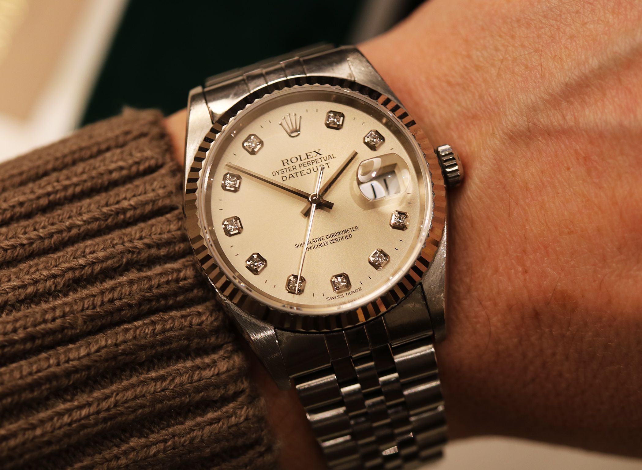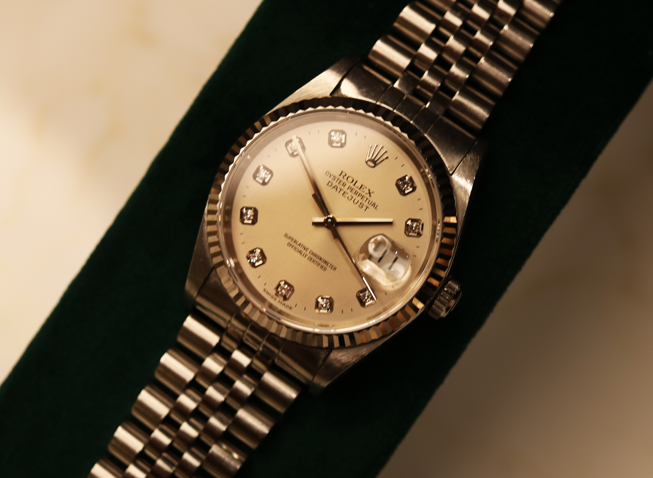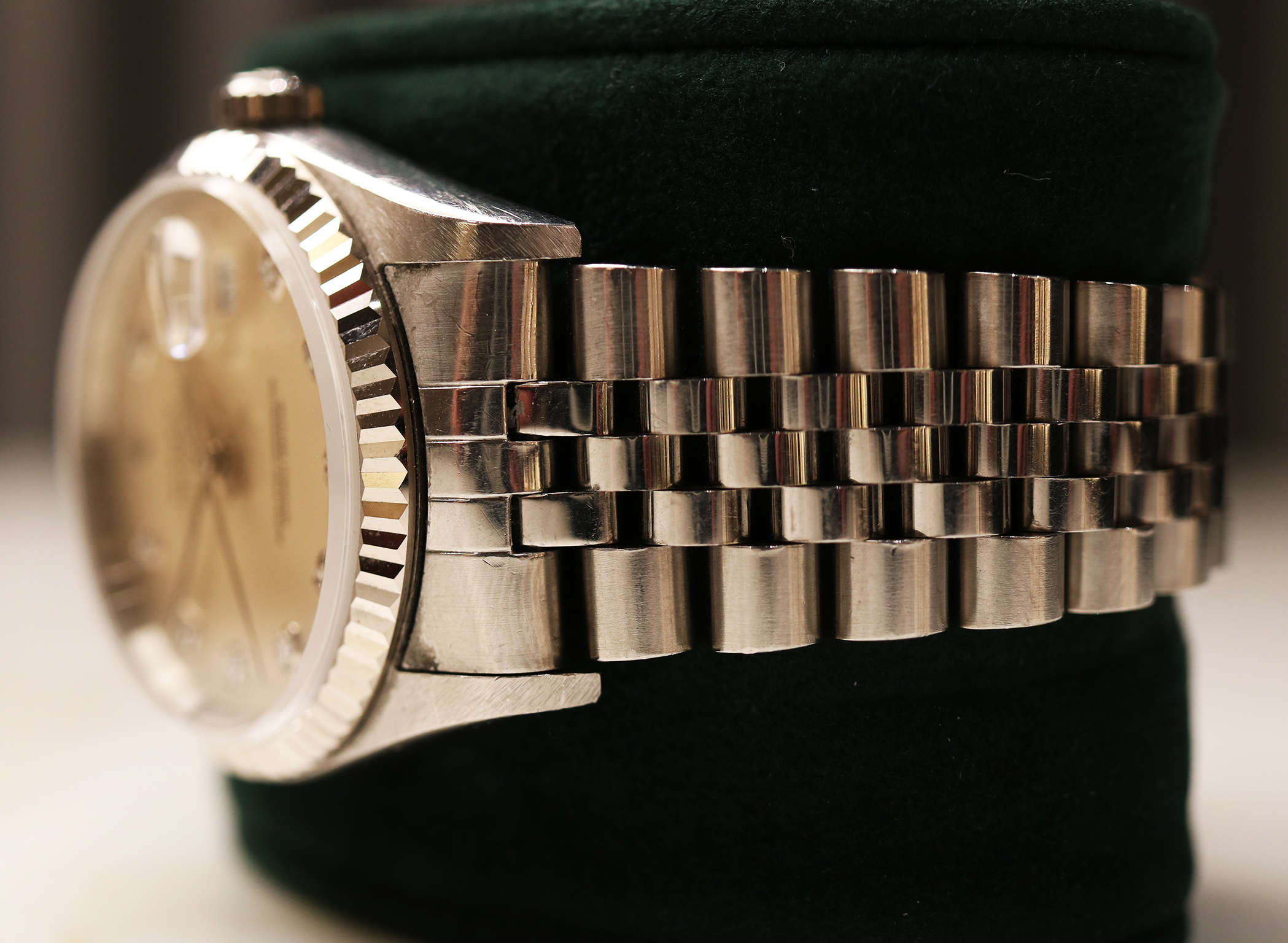 Questo esemplare si distingue per il quadrante argenté con indici in diamanti, una combinazione che conferisce luminosità e prestigio all’orologio mantenendo al tempo stesso un’estetica estremamente equilibrata. Gli indici in diamanti applicati catturano la luce con eleganza, impreziosendo il quadrante senza rinunciare alla tipica sobrietà Rolex.