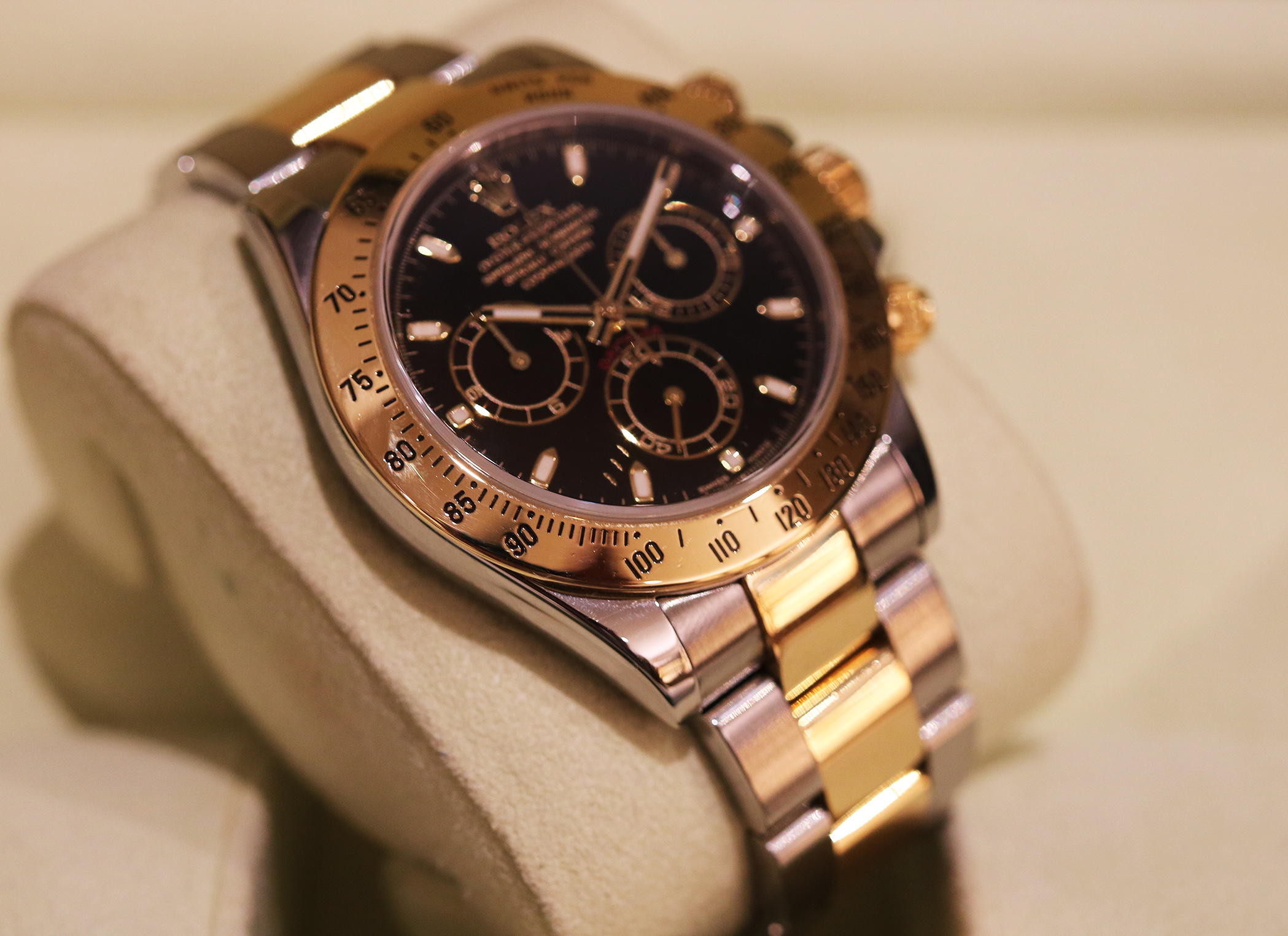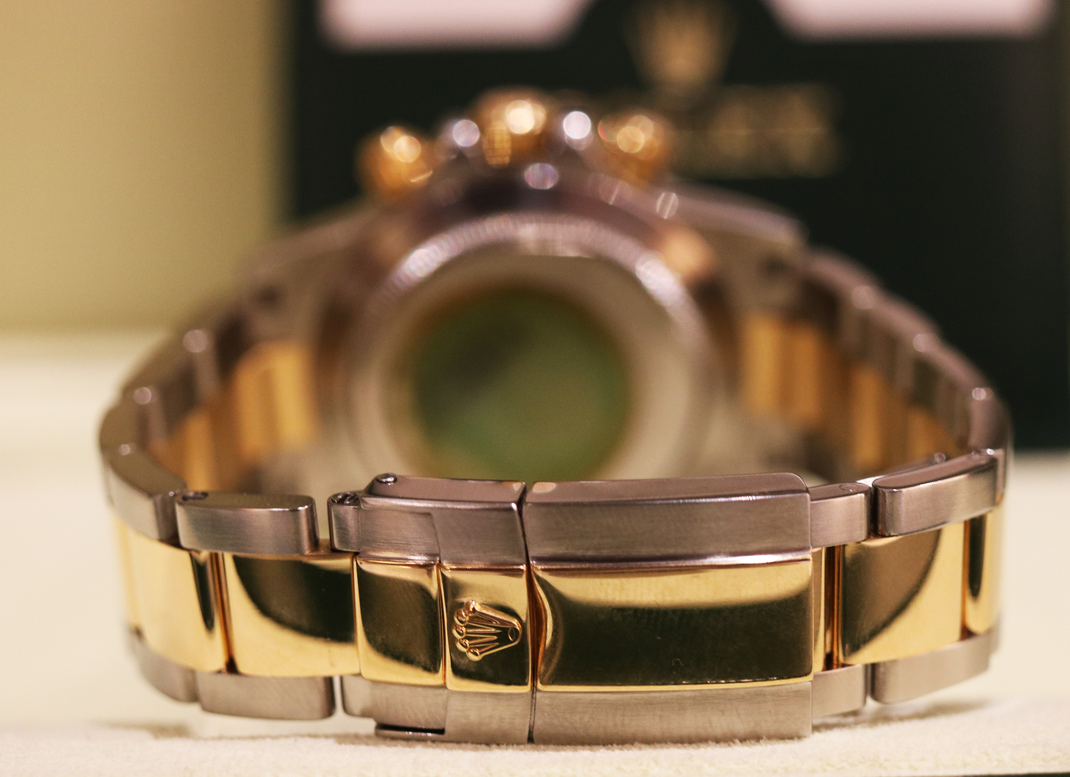 Il quadrante nero offre un forte impatto visivo, con indici applicati in oro e contatori cronografici a contrasto che ne esaltano la leggibilità e l’estetica. La lunetta tachimetrica in oro giallo permette misurazioni di precisione, mantenendo lo stile pulito e inconfondibile tipico del Daytona.